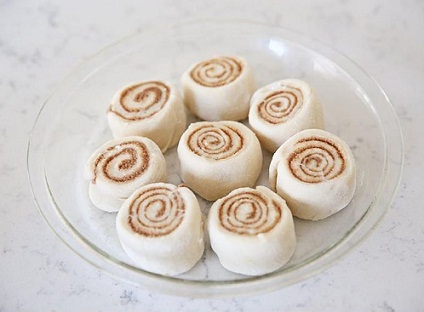- Now roll the dough into log shape carefully so that there is in break in between. Now you can cut the rolls into slices of about 3 to 4 inches. In a greased tray or sheet place the sliced rolls and make them into spiral shapes. Ensure that the space between the two rolls is enough to let it rise.
