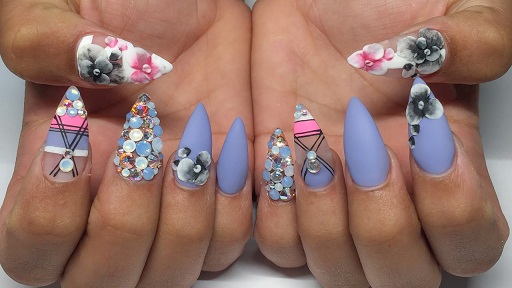 Probably the most radical acrylic nail art design available today the flowers and glitters complement each other greatly. You have to use false nails which are longer to help achieve this design completely because of the sheer amount of texture available with this design.